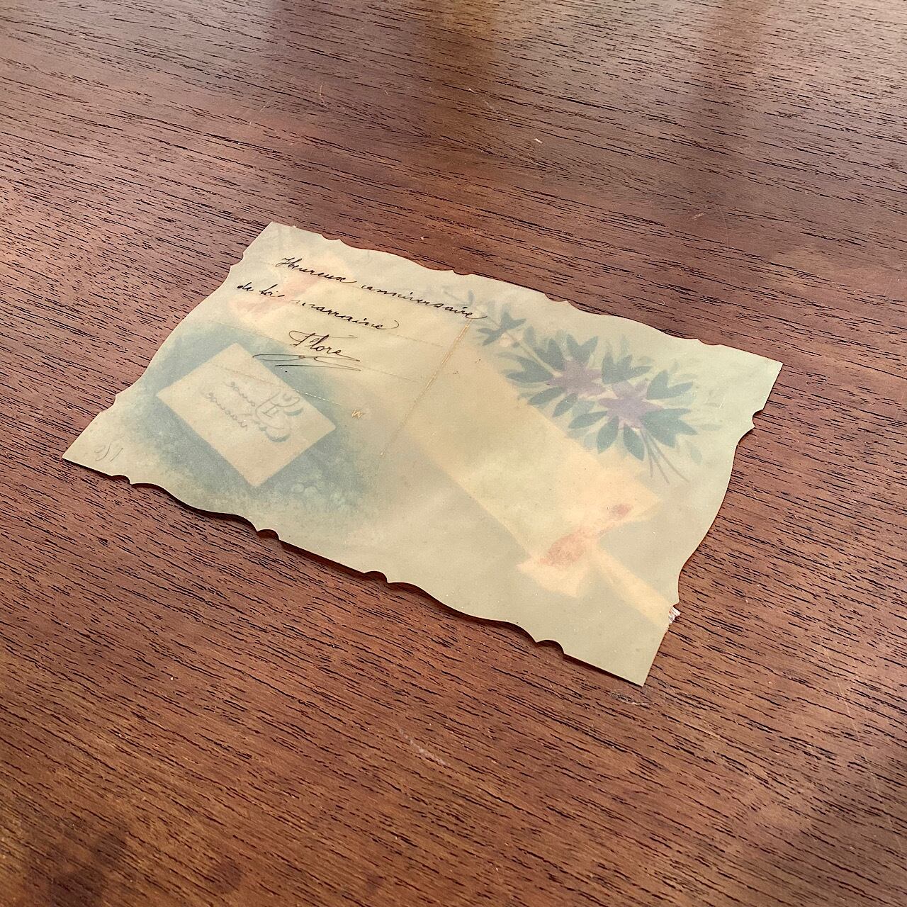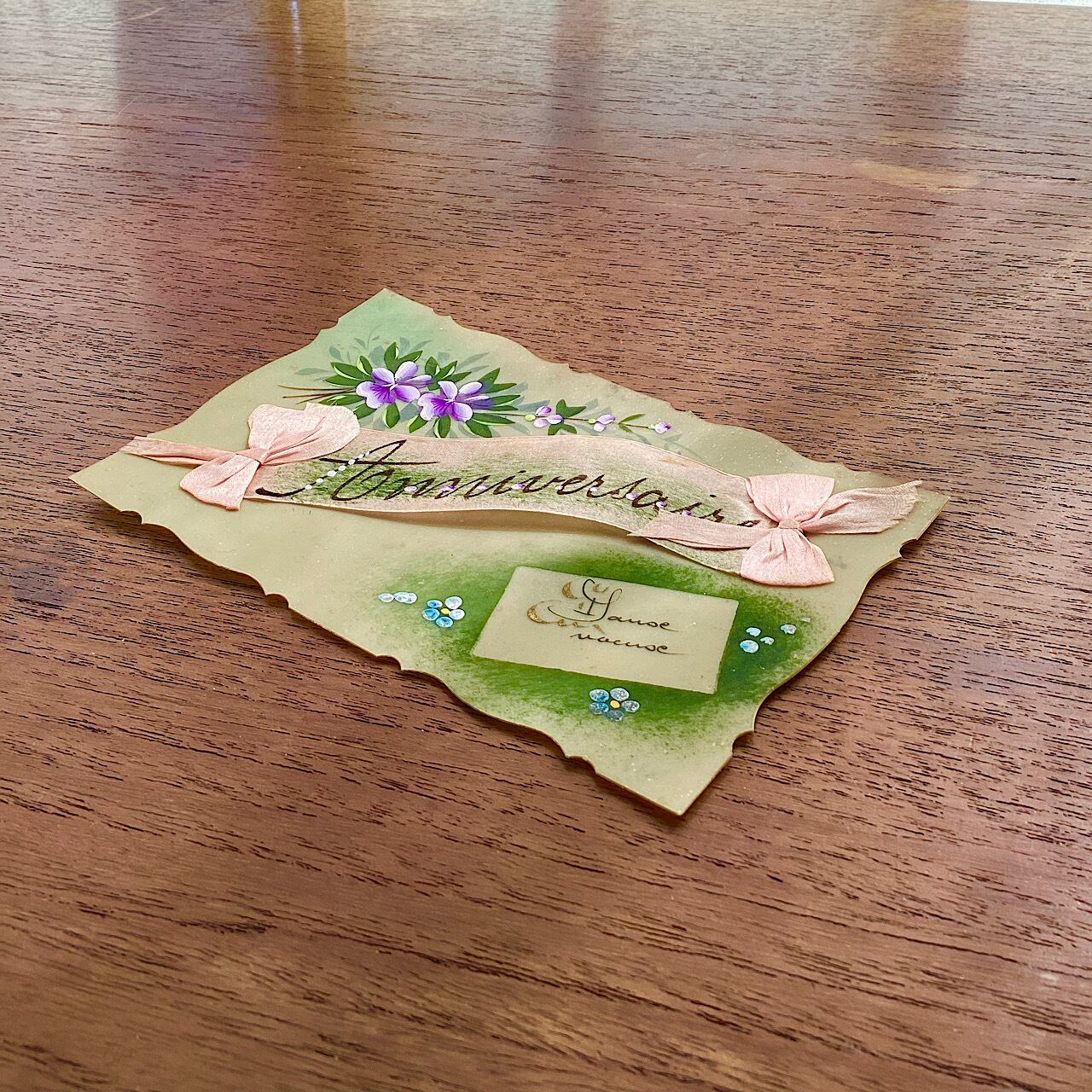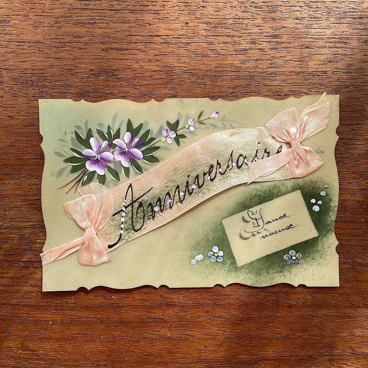 セルロイドの葉書に花などが手描きで描かれ、中央のリボンにAnniversaire(記念日)書かれた