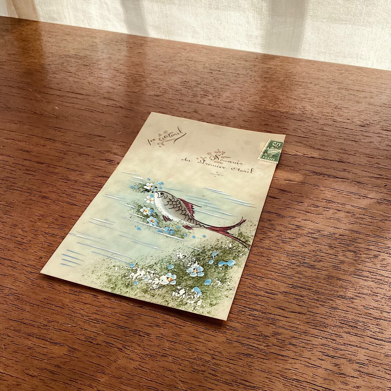 セルロイドの葉書に花と川を泳ぐ魚の手描きの絵が描かれています。裏面に記入なし。