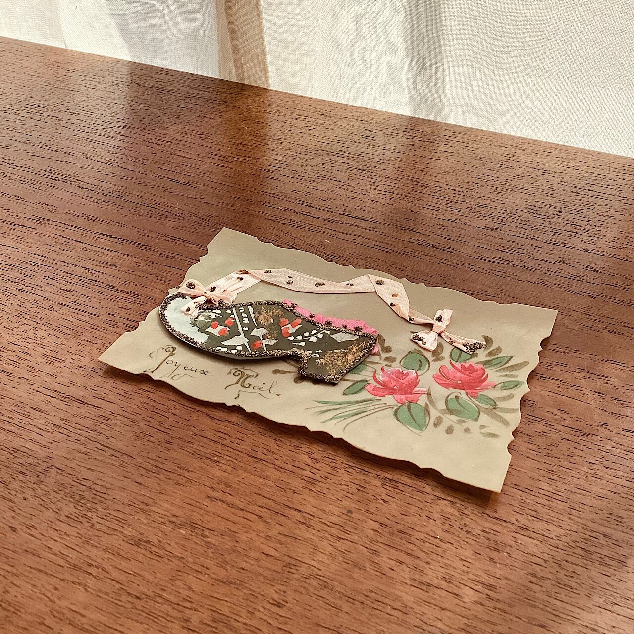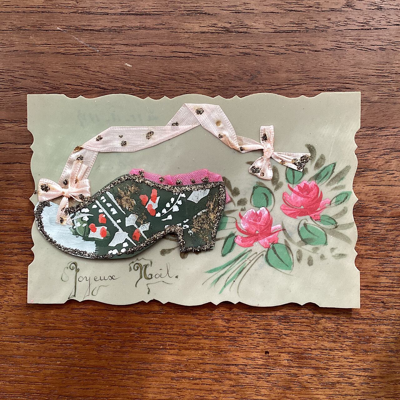 セルロイドの葉書に木靴のモチーフそこに手描きで柄が描かれています。他の花の絵も手描き。裏面に記入あり。リボン上のラメ部分に変色が見られますが、100年程度昔の物ですのでご容赦ください。状態は概ね良好です。裏面に25-12-1927 と書き込み