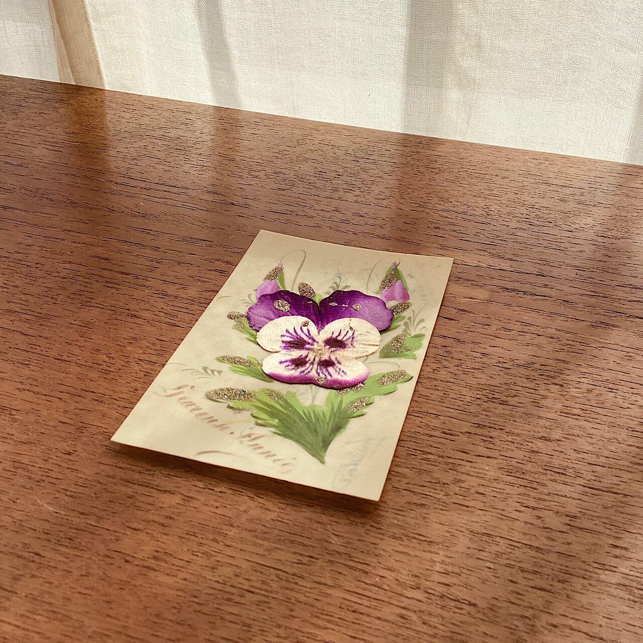 セルロイドの葉書に立体的なフェルトのパンジーのモチーフが、葉の部分は手描きで描かれています。裏面に記入あり。状態は概ね良好です。