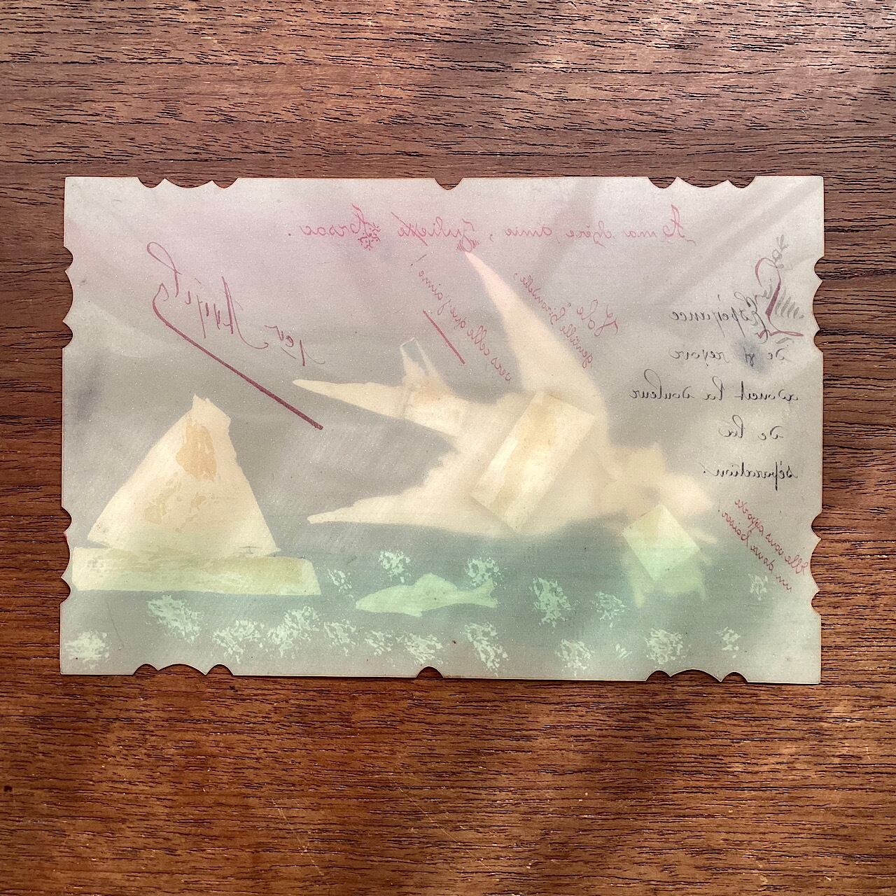 透明のセルロイドに当時のクロモスが貼られています。海と空の色のグラデーションの彩色も美しく、表面に1903と記入があり、裏面への書き込みはありません。