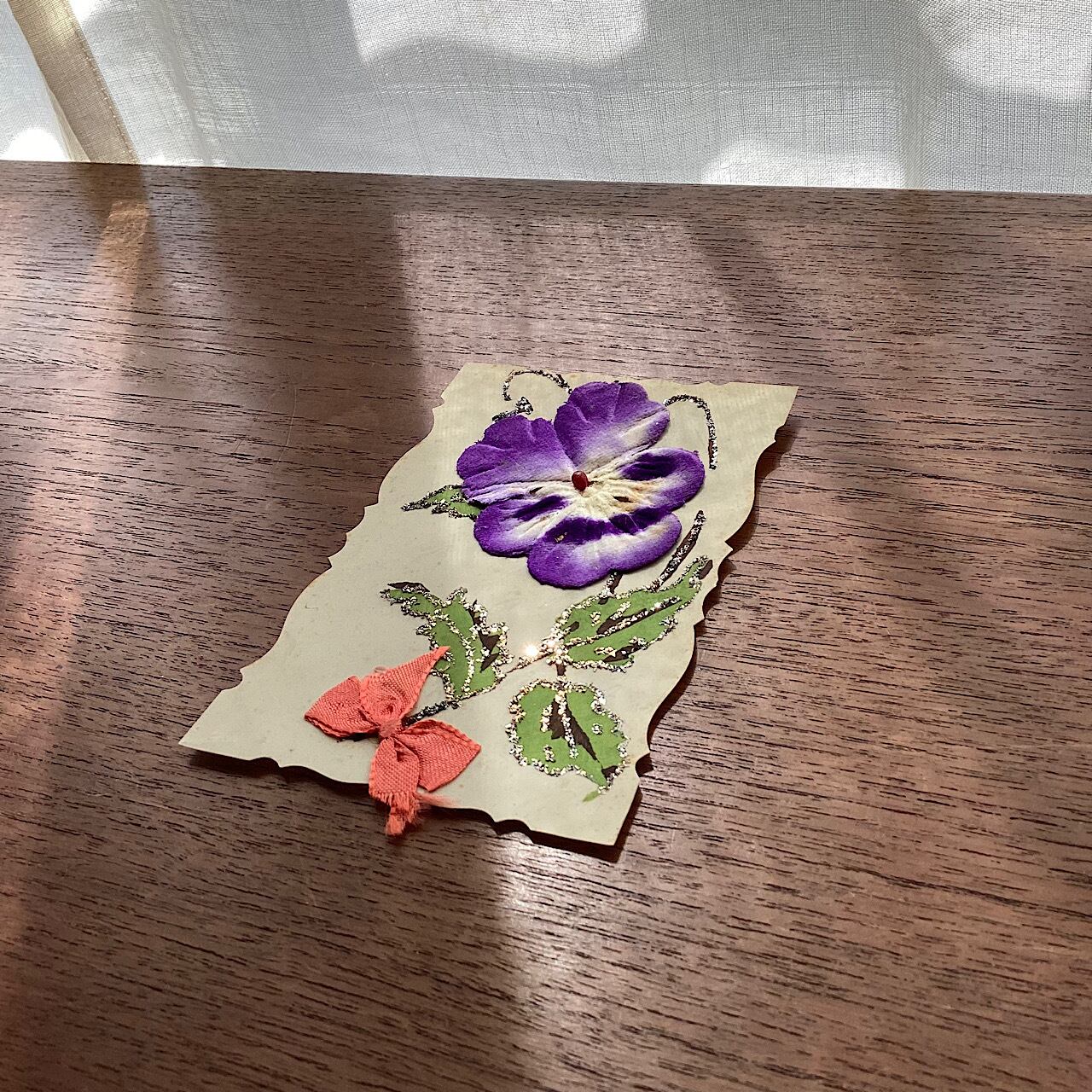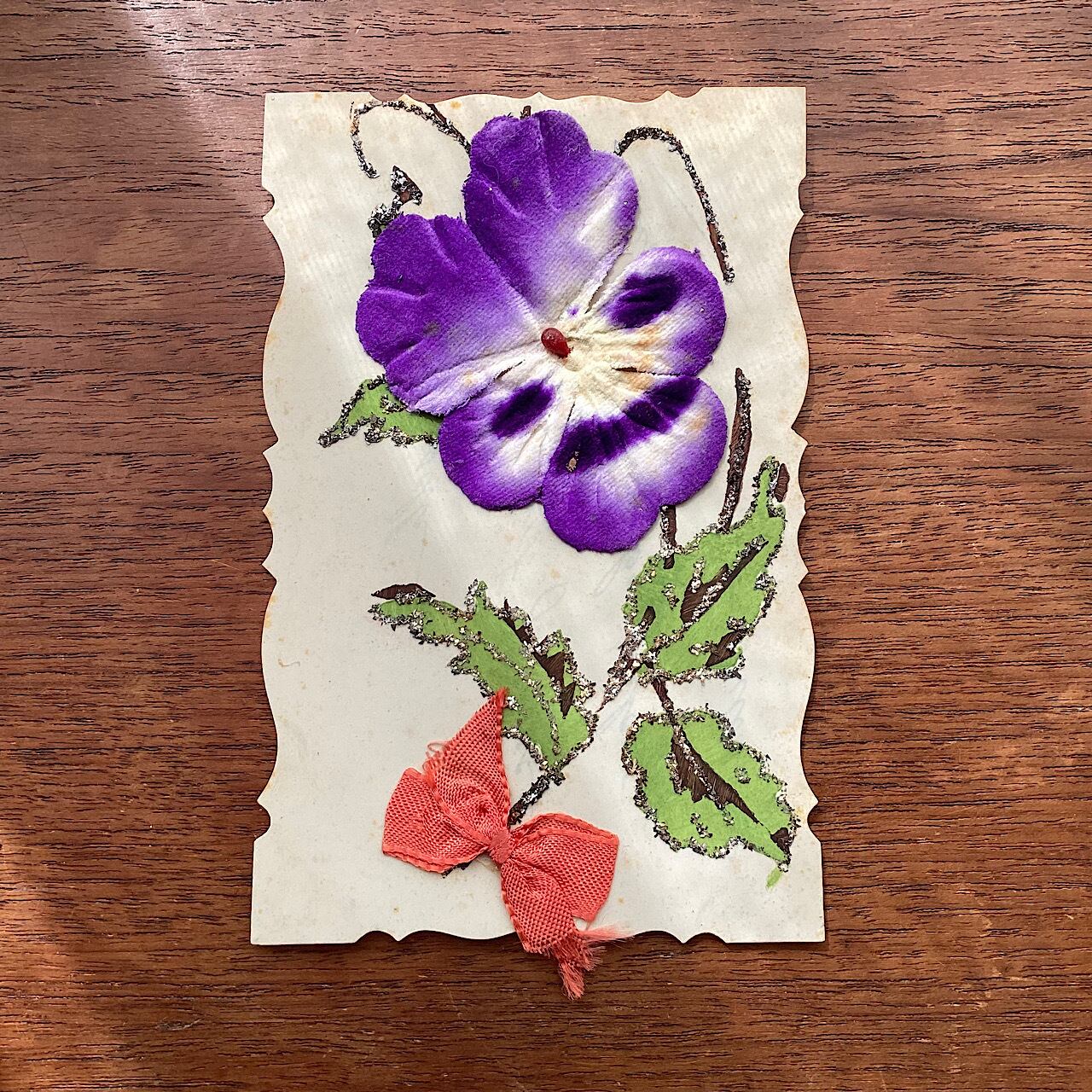 セルロイドの葉書にフェルトのパンジーが貼られています。ラメ部分に変色が見られますが、100年程度昔の物ですのでご容赦ください。裏面にメッセージの記入があります。