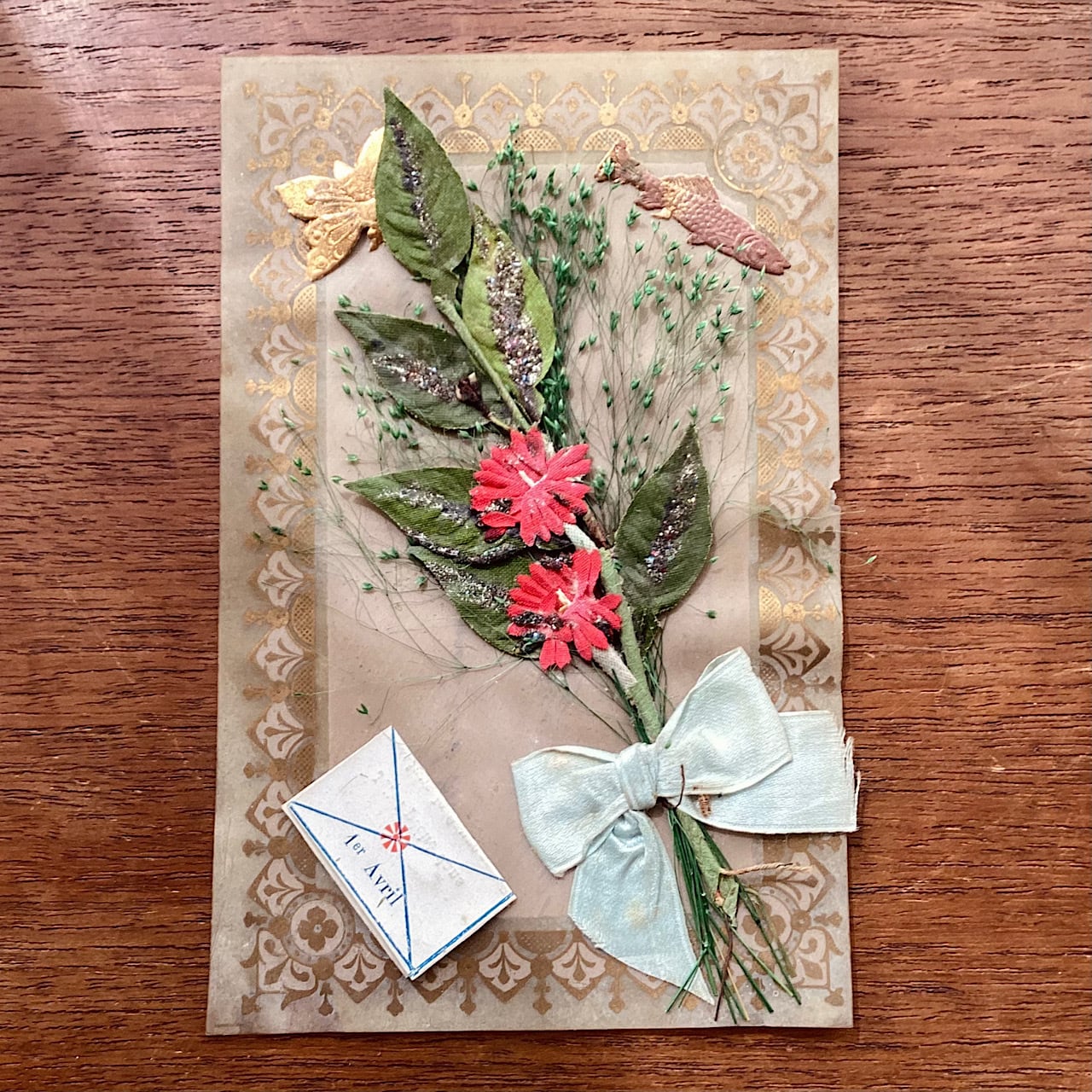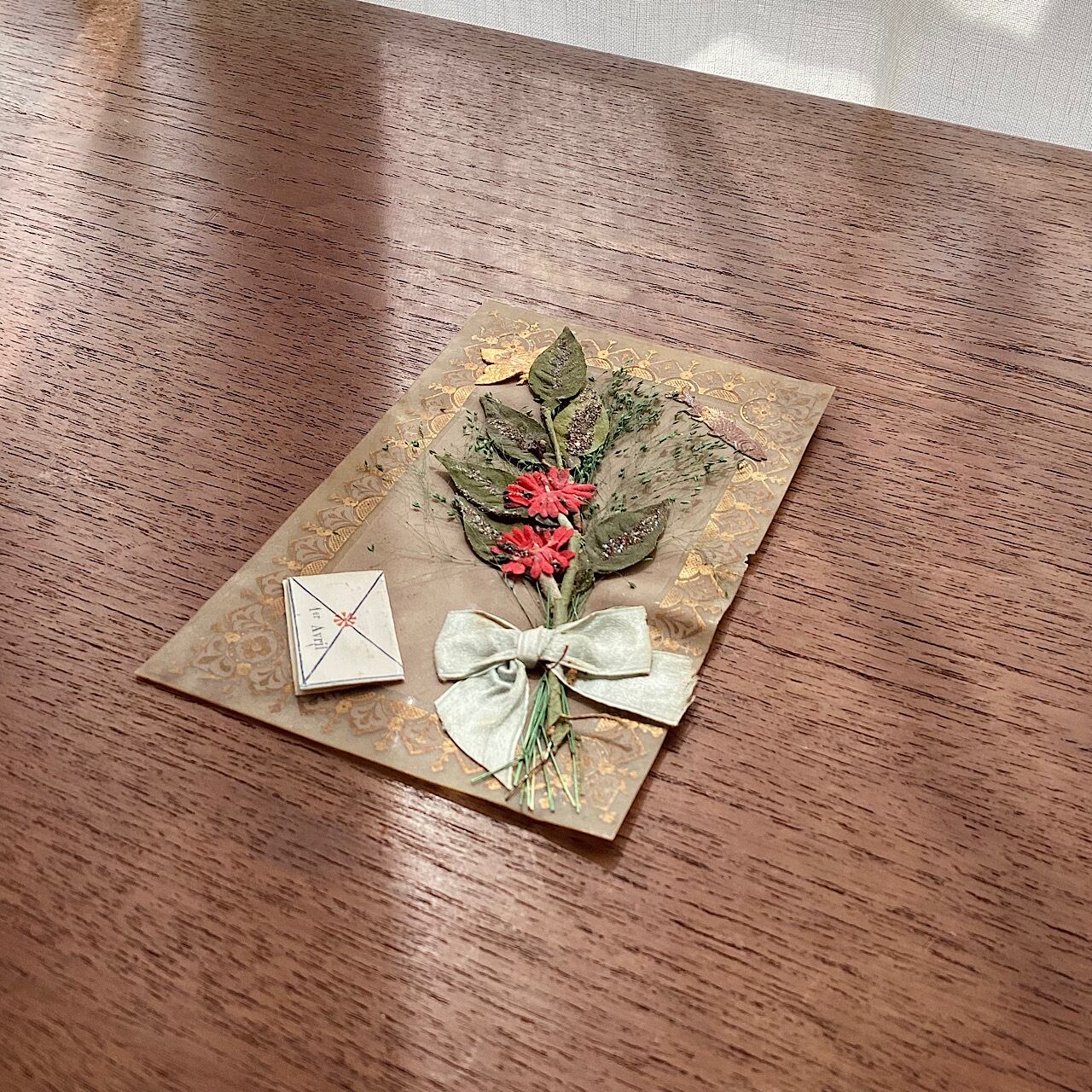 セルロイドの葉書に金彩の飾り罫、布やドライフラワーを使った小さいブーケのモチーフが貼られています。小さな手紙も貼られています。リボンやラメ部分に変色が見られ、全体的に波打ったような歪みがあります。100年程度昔の物ですのでご容赦ください。