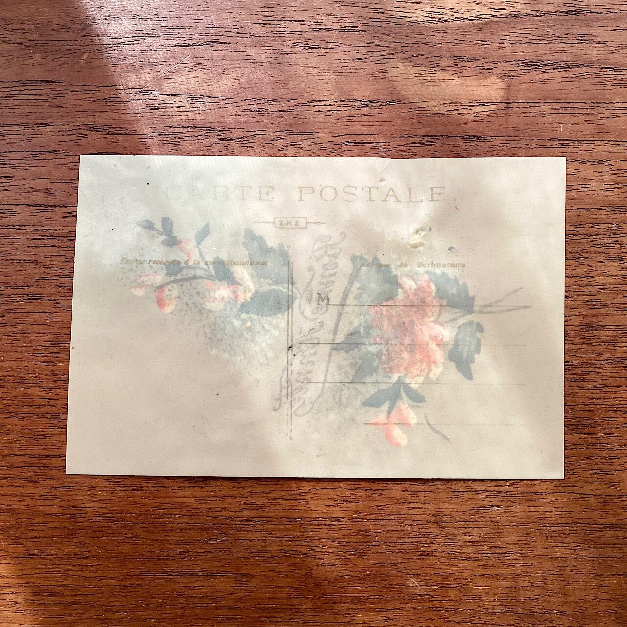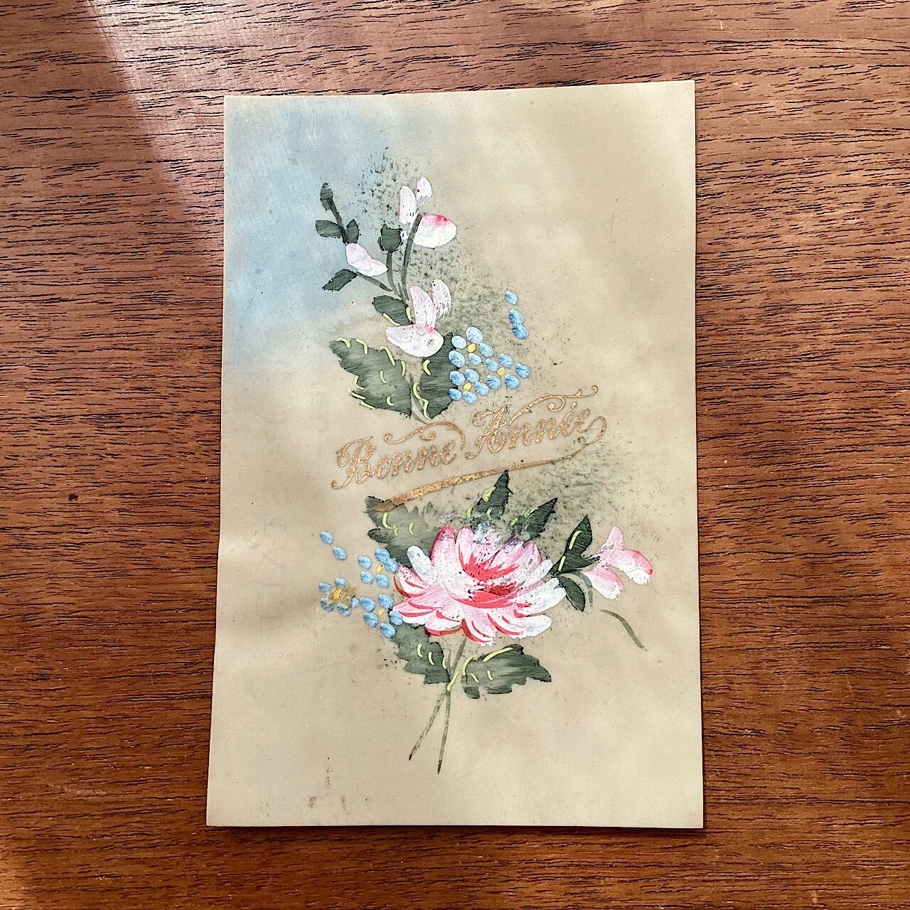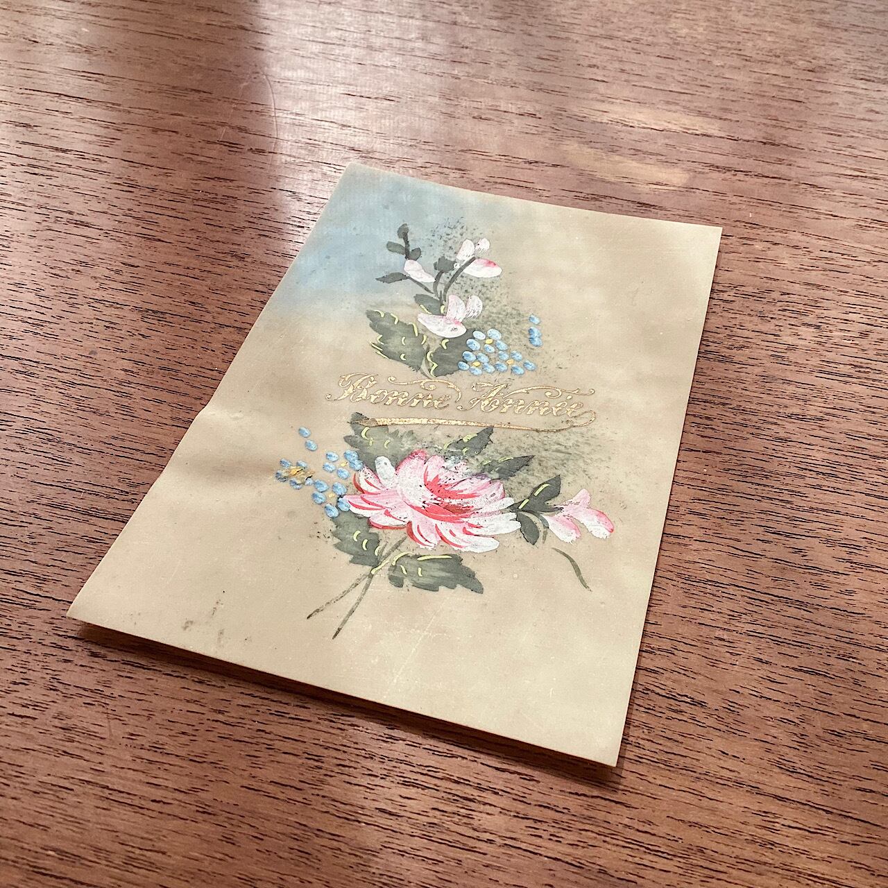 セルロイドの絵葉書に手描きの花の絵が描かれています。裏面には記入なし。葉書全体に経年による歪みがあります。100年近く昔のものですのでご容赦ください。