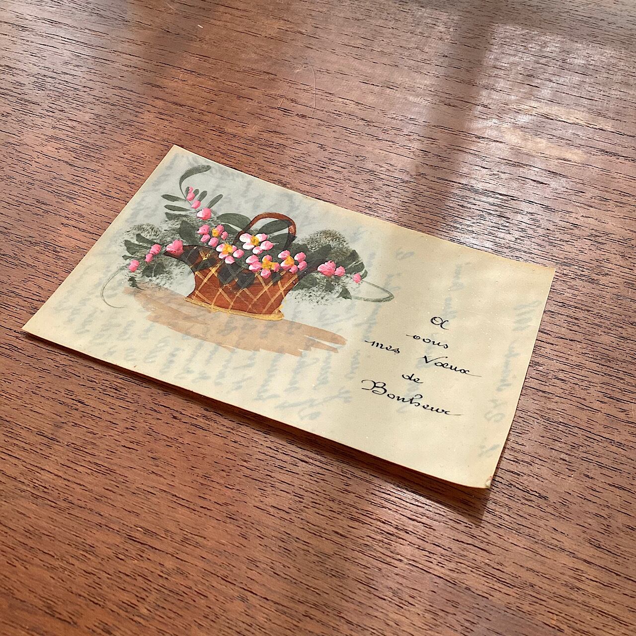 セルロイドの葉書に手描きの花籠が描かれています。裏面の記入あり、表に裏映りしています。状態は概ね良好です。